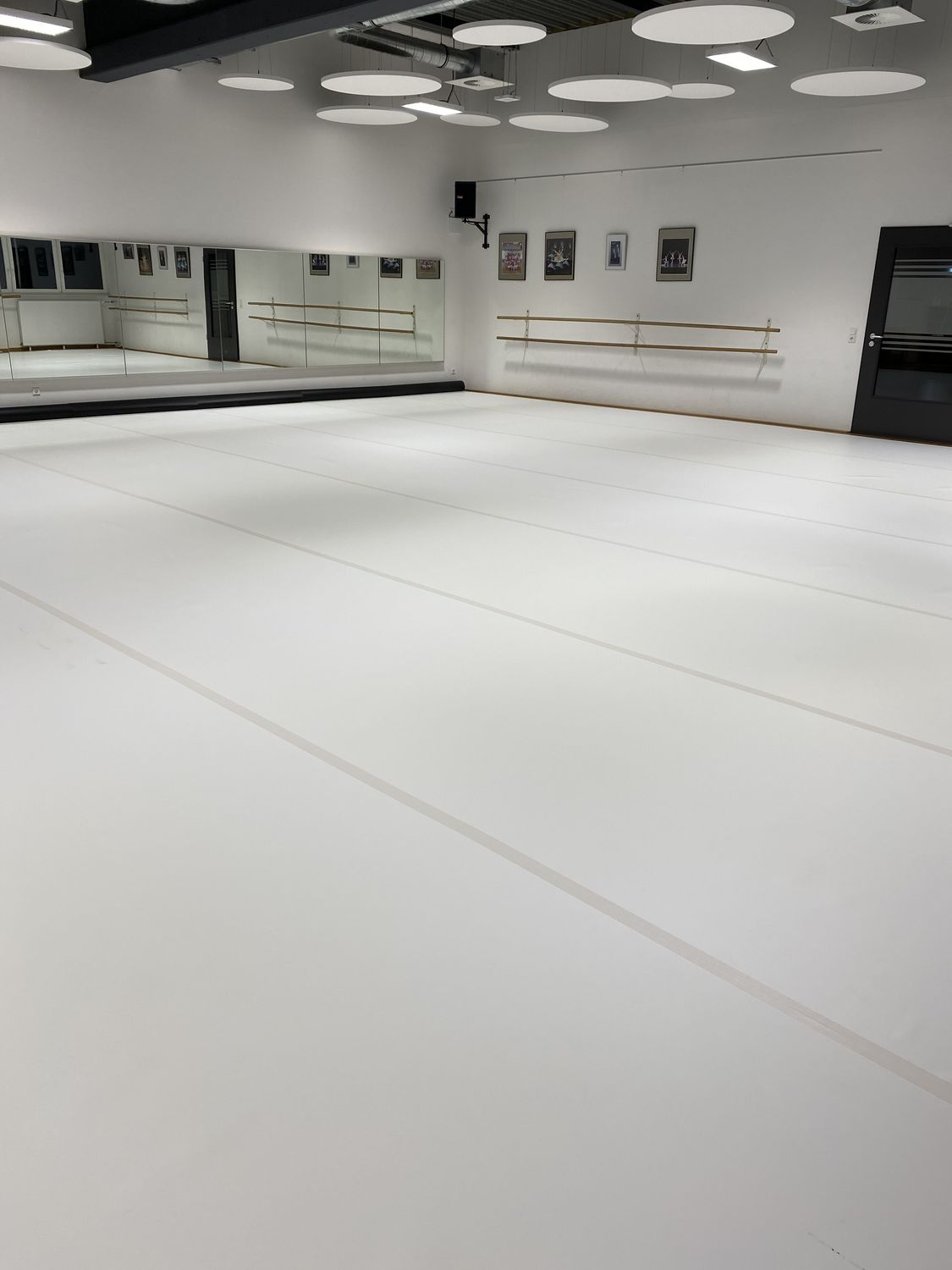 Der helle, lichtdurchflutete Ballettsaal verfügt über einen Elastikboden, einen hochwertigen Tanzteppich von Harlequin und zusätzlichen beweglichen Stangen. Eine große Spiegelwand und eine Musikanlage mit vier großen Lautsprechern komplettiert den Ballettsaal.